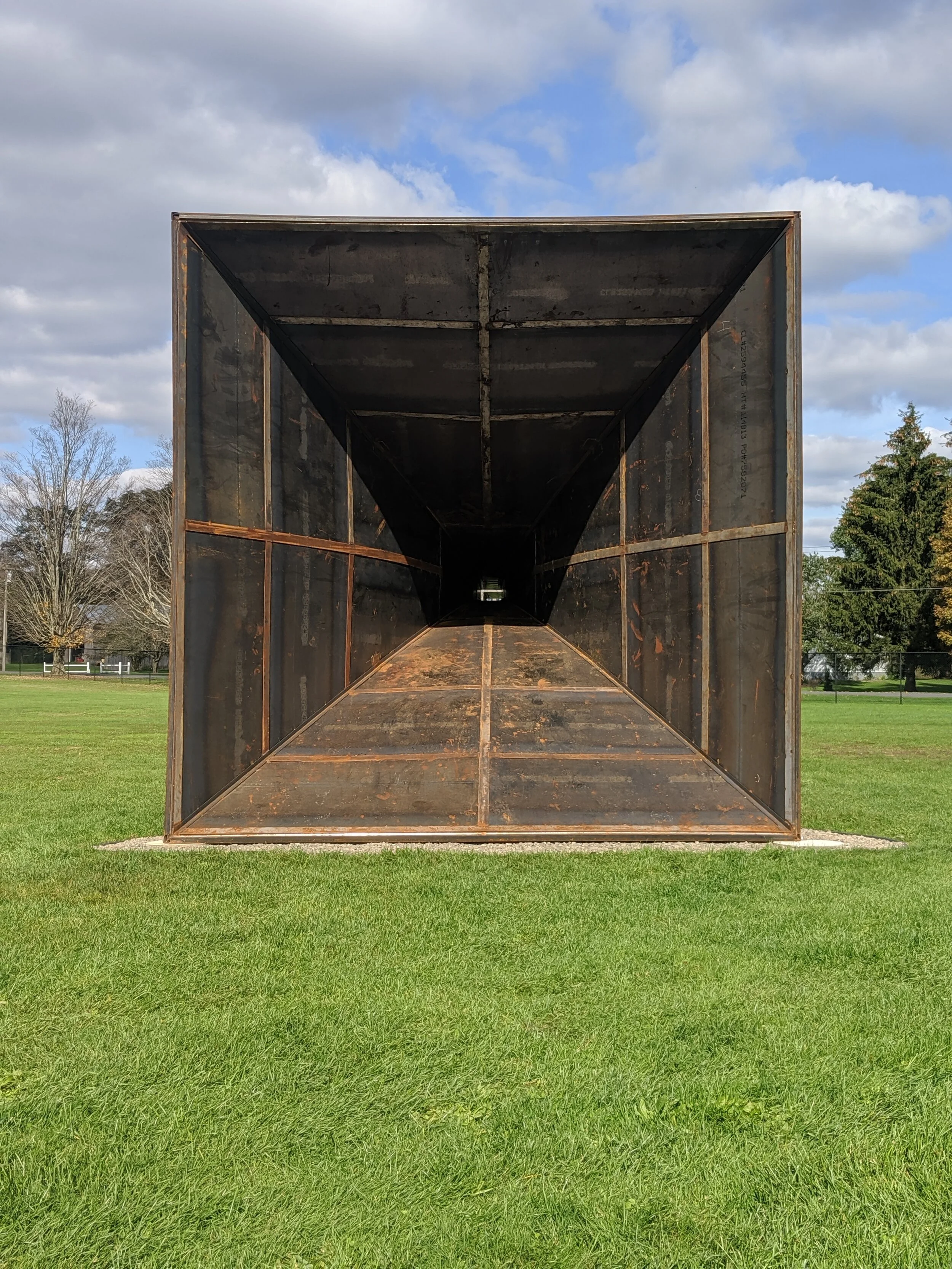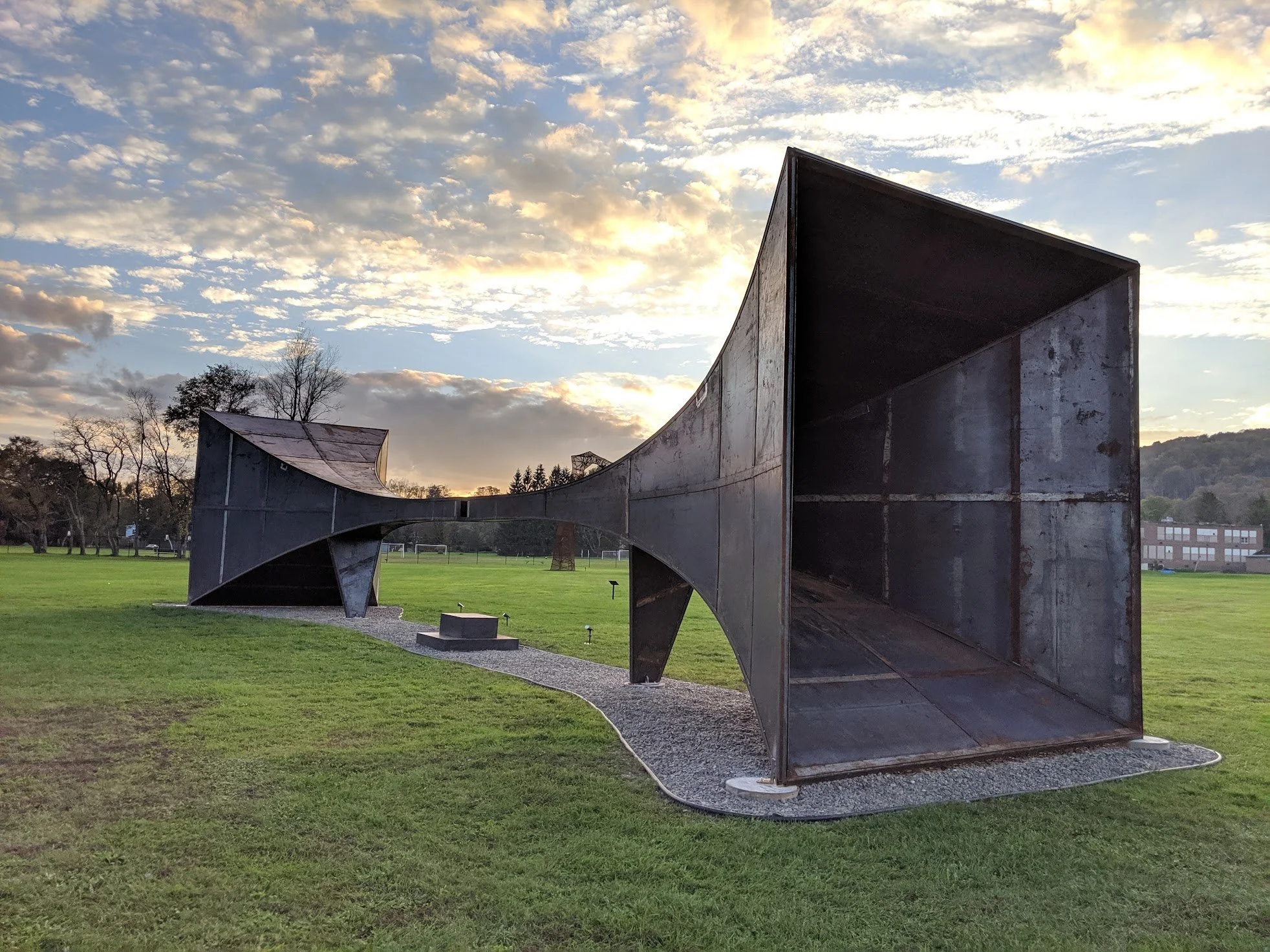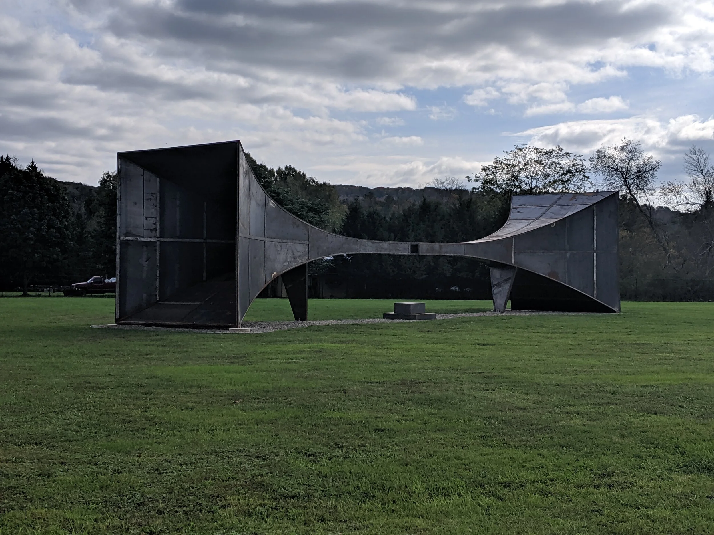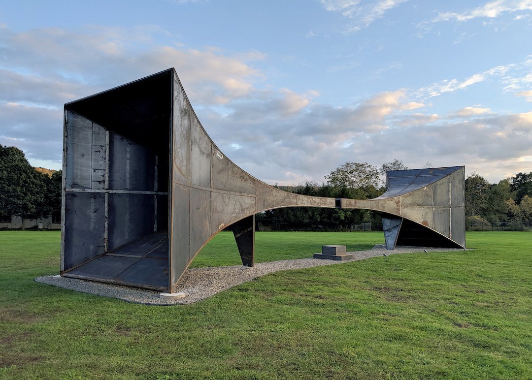 This site-responsive sculpture was inspired by WW1 pre-radar listening devices that would capture sound from great distances allowing the listener to experience the amplification of the area in case of impending danger. In this case, the central point offers an opportunity to slow down, listen, feel, wait, and be in that space between spaces. The shape and placement align with the Butternut Valley in Gilbertsville NY and will capture and intensify the sound for the participant. In using the sound beyond what we can hear as a momentarily found object; capturing it, and focusing it to interact with what extends past our sight.