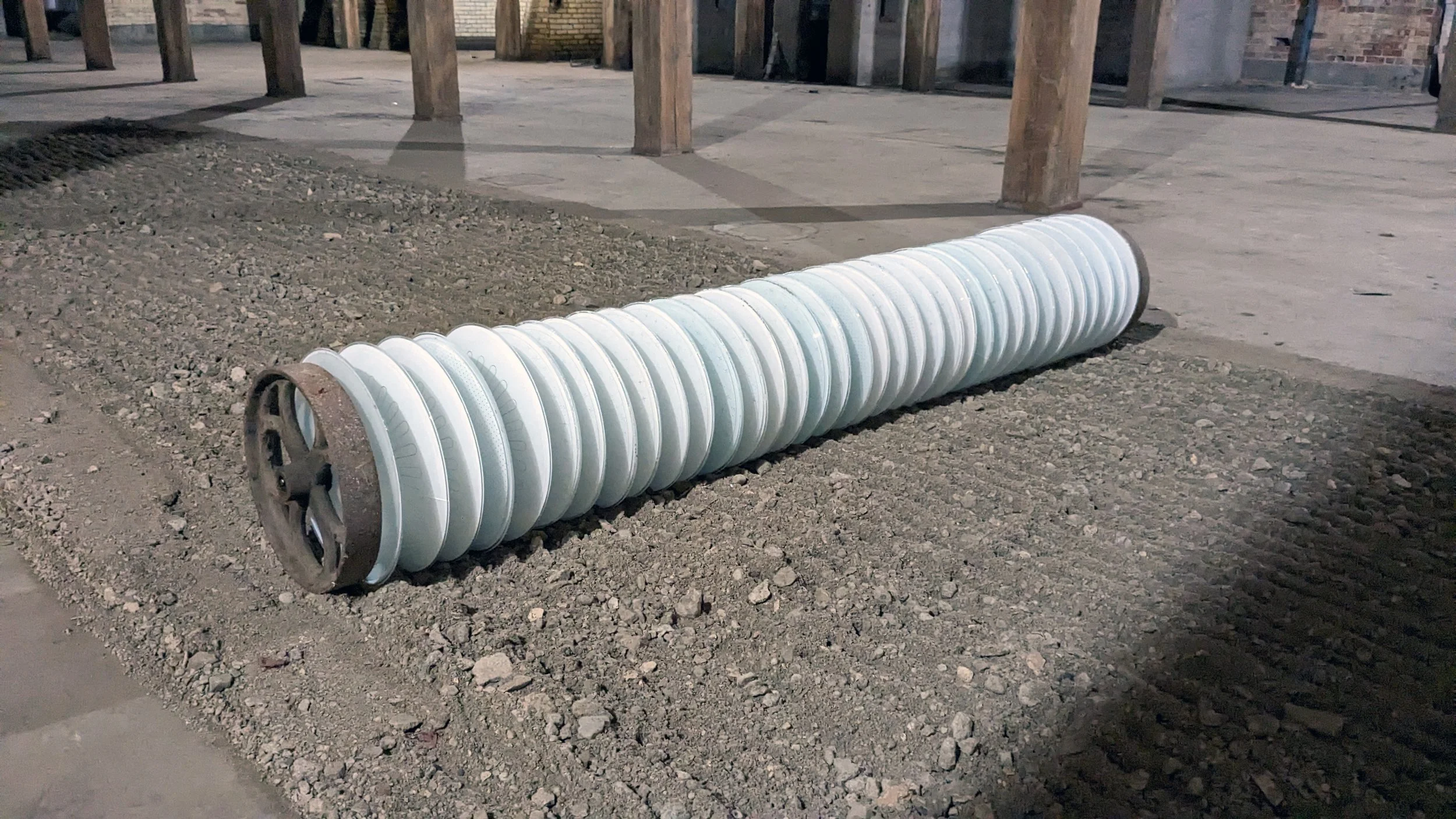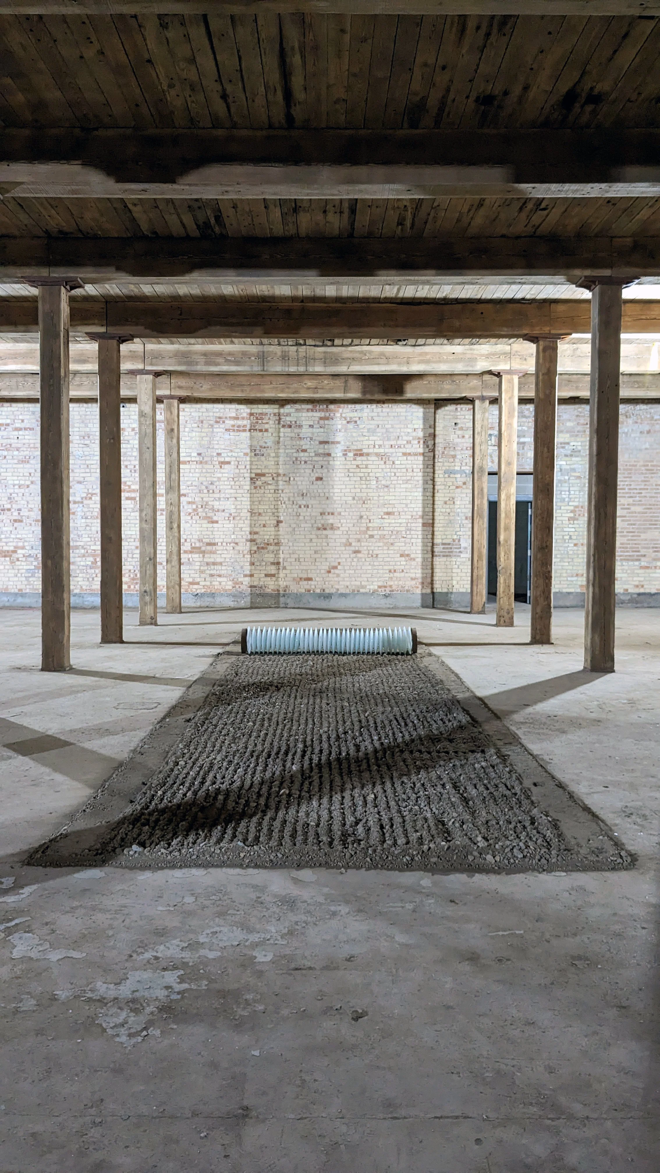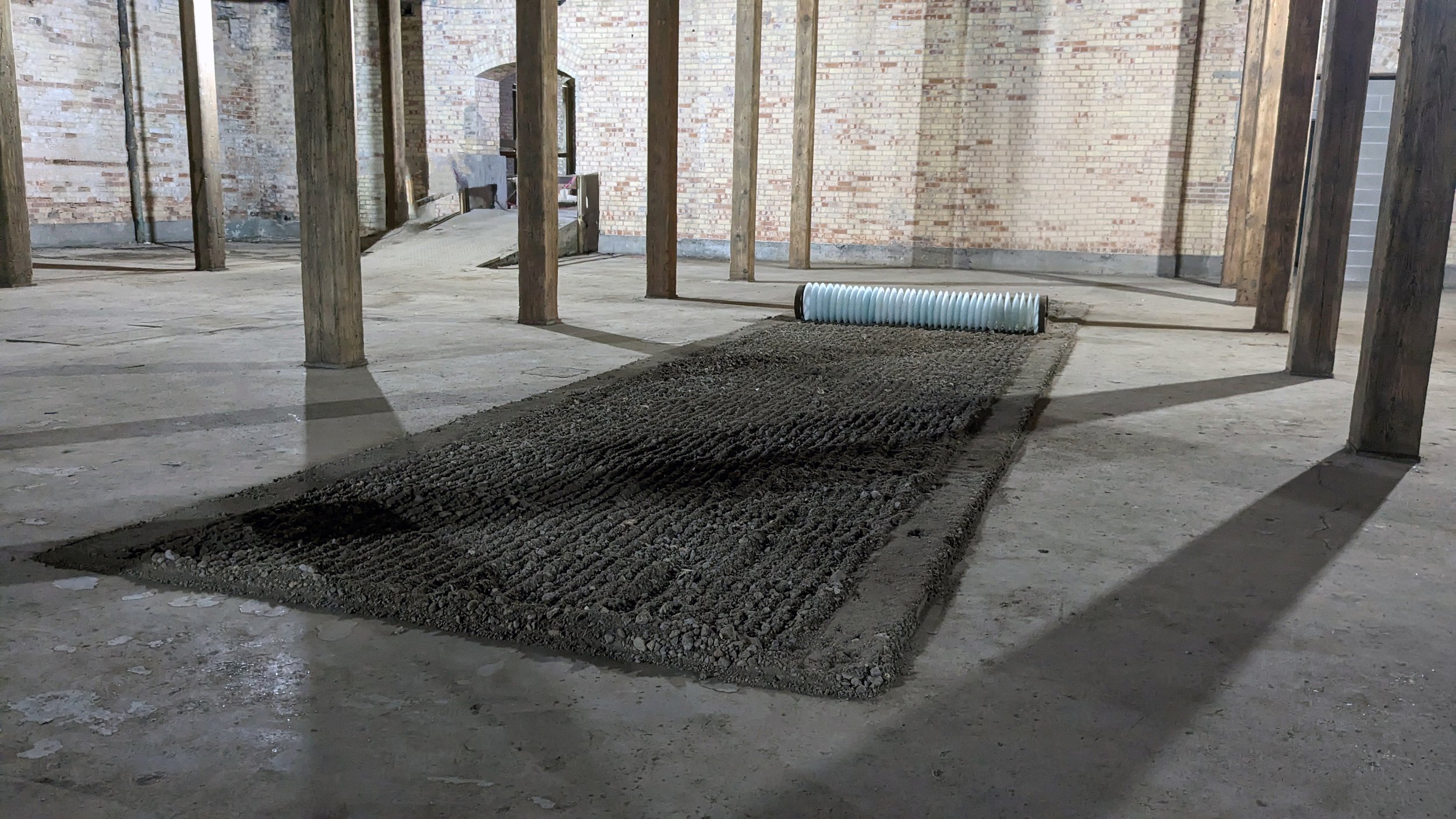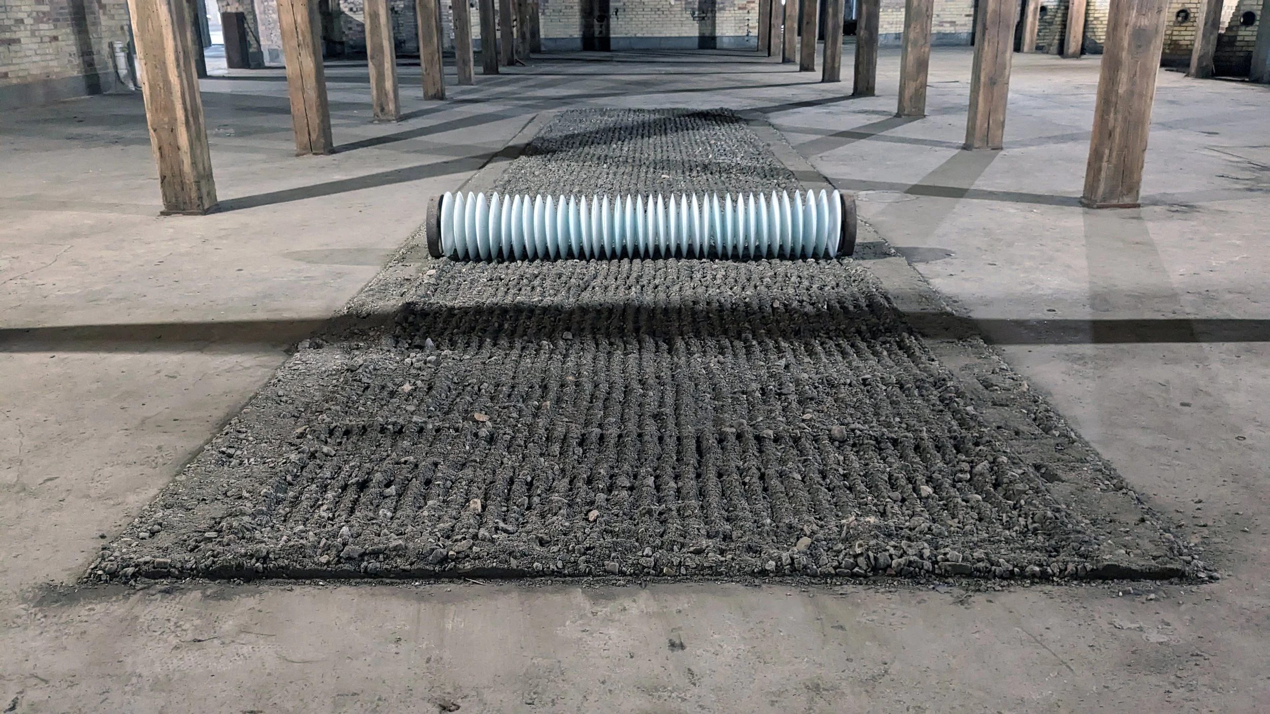 Installed in the now-vacant Lee Paper Company Mill Complex, a former factory listed on the National Register of Historic Places in 2016. It was established in the Kalamazoo River Valley in 1866, with the opening of the first paper mill in the area. For nearly 100 years, the Mill defined manufacturing in Vicksburg as a pillar of the community that impacted every aspect of life in the Village of Vicksburg, Michigan. It turned cotton rags into fine writing paper. This installation responded to the Mill and surrounding farmlands that comprise most of Southern Michigan. Using the stone and dirt debris from the preservation and construction of the mill paired with a glass harrow, a device used after plowing for breaking up and smoothing out the surface of the soil. The purpose of harrowing is to break up clods and provide a soil structure, called tilth, suitable for planting seeds. Reflecting on the fragile agricultural system that sustains our daily life but is also balanced with the climate systems we rely on for food.